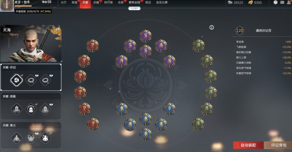 天海最新的天赋选择核心在于最大化怒气获取与生存能力,确保其核心奥义金刚伏魔能够频繁开启并发挥控场作用。在天赋印记的搭配上,红色本源印记建议携带6个怒气回复相关的易怒印记,以加速怒气自动恢复;紫色极阴印记推荐采用4个反噬(受伤怒气转换)和2个暴怒(伤害怒气转换)的组合,保证在挨打和进攻时都能高效积攒怒气;绿色万物印记应选择6个增加精力上限的顽石,以支撑更频繁的闪避和连招;蓝色极阳印记则可携带6个减少技能冷却的急速或增加飞索距离的神索,前者能缩短金钟罩的冷却时间增加反打机会,后者则提升机动性。这套配置让天海在团战中能更快变身,并拥有足够的精力进行周旋。