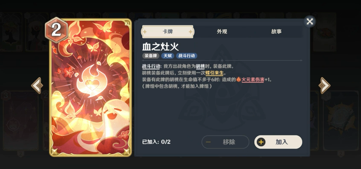 血之灶火是胡桃的专属天赋卡牌,装备后能显著提升火元素输出能力。当小伙伴们使用胡桃出战并装备这张牌时,会立刻触发一次蝶引来生效果,同时当胡桃生命值不超过6点时,造成的火元素伤害额外+1。这张牌的核心价值在于低血量时的爆发增益,适合追求高风险高回报的战斗风格。需牌组中必须包含胡桃角色牌才能加入血之灶火,因此它属于特定体系的构筑组件。