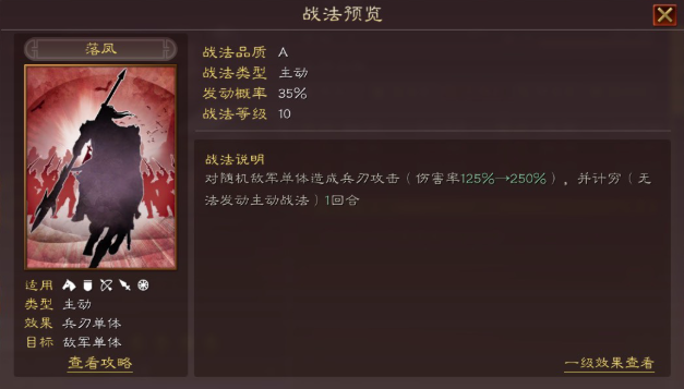 张任的自带战法落凤具有高额兵刃伤害与技穷控制效果,这决定了其兵书必须与之形成联动。以治击乱能提升对受控目标的伤害,完美适配落凤的技穷特性,当敌方处于控制状态时可额外造成18%伤害增幅。而鬼谋提供的4.5%主动战法增伤则进一步强化了落凤的输出上限,两者叠加可使单次战法伤害提升超过20%。这种搭配在群弓阵容中尤为突出,能有效弥补紫将属性不足的缺陷。