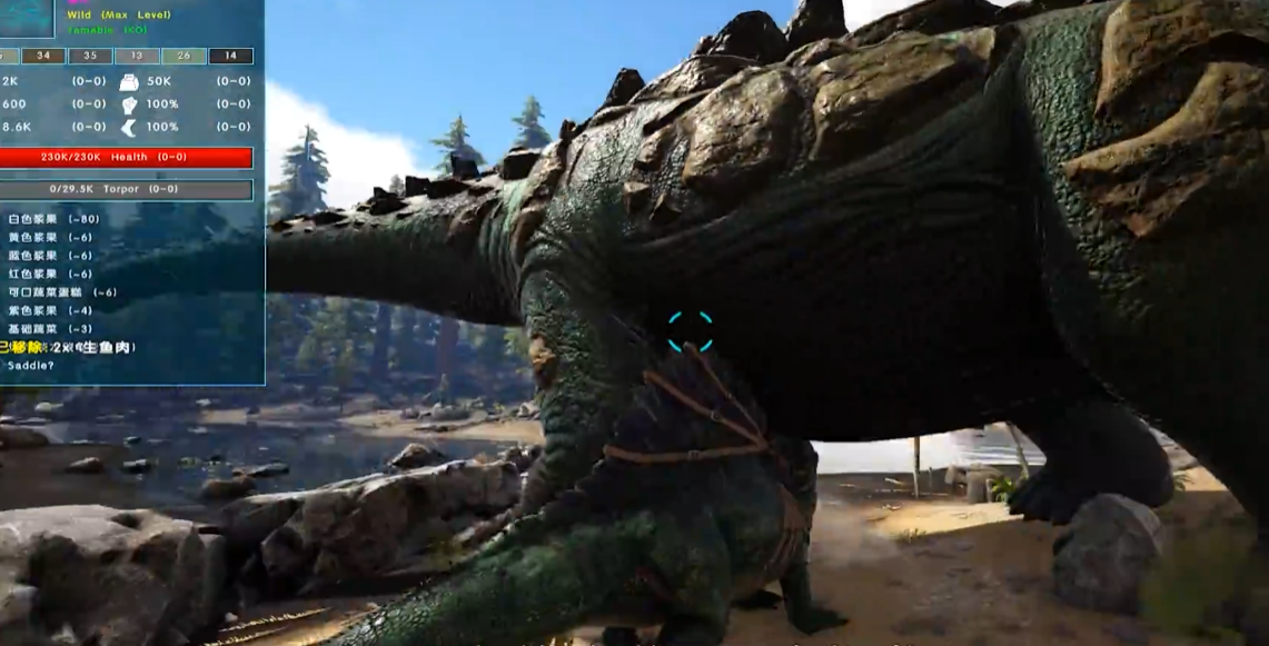 成功驯服后,泰坦龙会立即获得平台鞍功能,允许在其背部建造大型防御工事或资源运输平台。尽管其基础生命值高达23万,但驯服后会永久削减8万血量,且无法通过进食恢复。该生物左键前肢践踏可对中小型目标造成范围伤害,右键后腿蹬击适合应对单体高威胁目标,但攻击会快速消耗耐力值。需注意其氧气属性极低,涉水时行动会严重受限。
