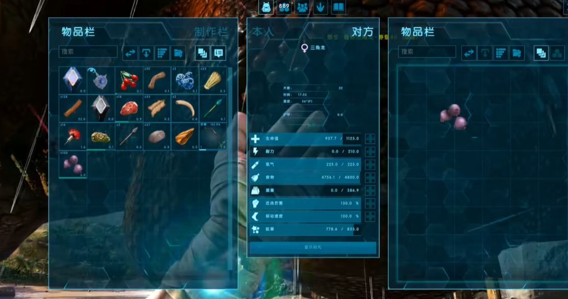 三角龙的驯服流程需要先使用麻醉箭或弹弓将其击晕,注意其头部具有伤害减免效果,建议瞄准身体或腿部攻击。击晕后打开物品栏放入紫色浆果,若恐龙处于饱食状态,可通过强制喂食白色浆果(Narcoberry)降低饱食度。黑色浆果(Stimberry)用于维持眩晕值,需在眩晕条下降至50%时补充。驯服低等级(20级以下)三角龙约需40分钟,消耗50-80个紫色浆果,这是性价比最高的选择。