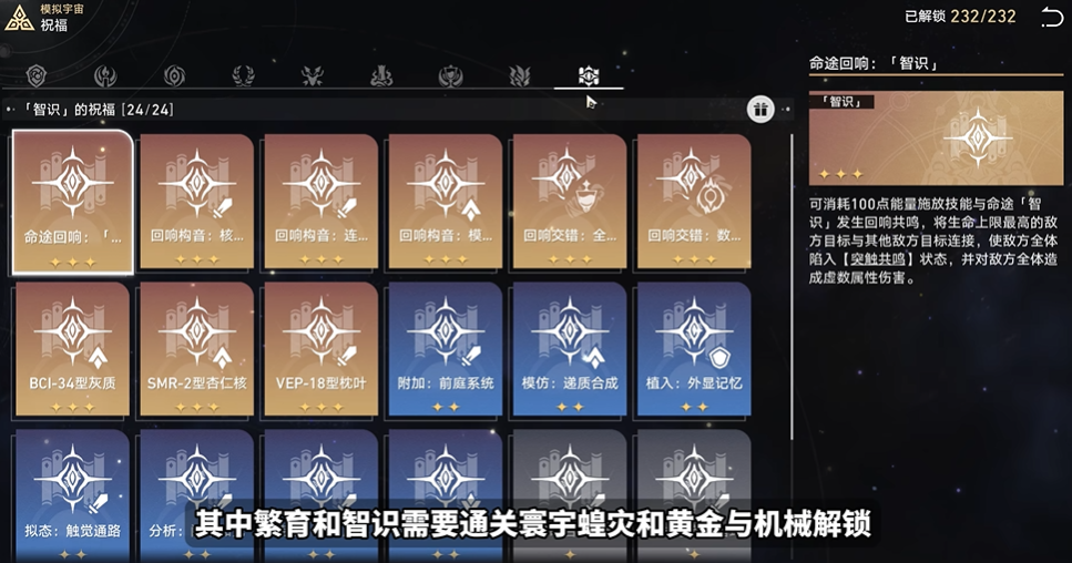 技能树系统是模拟宇宙的长期成长要素,通过反复挑战积累技能点解锁永久增益。初期建议优先点出增加祝福选项、提升初始资源等基础能力,后期再强化特定命途效果。阵容搭配需兼顾输出、生存与功能性,常规组合包括主C、辅助、护盾/治疗角色,但也可尝试纯输出或特殊流派。战斗中需注意敌人弱点属性,利用命途回响技能(集齐3/6/10个同系祝福解锁)扭转战局,例如巡猎命途的充能效果适合爆发输出。