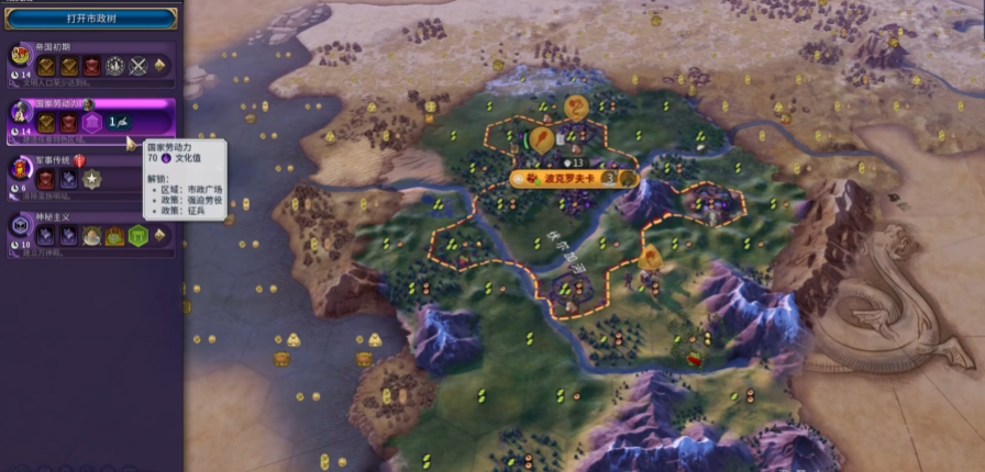 科技与文化发展存在明确的优先级序列。科技树应围绕战略资源解锁展开,若开局地块含马、铁则优先青铜器,沿海城邦需尽早研发航海术。文化树初期重点解锁政治哲学,快速进入古典政体时代。区域规划需遵循相邻加成规则,学院区需靠山,工业区需邻接矿山,商业中心沿河建造。万神殿选择以节庆女神(种植园加成)或天空女神(牧场加成)为主,若25信仰时出现宗教移民则必选。