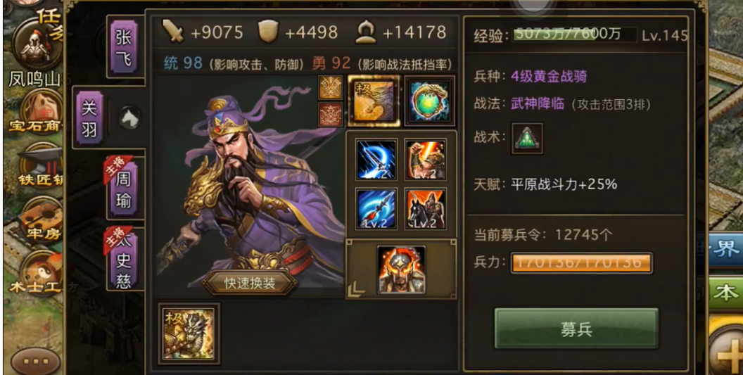 战术执行层面需严格遵循战法释放顺序。关羽起手战法需命中首名敌将前三排,周瑜战法须覆盖第二敌将全体,典韦战法须在第三敌将行动前触发眩晕。张飞作为收尾武将,需保留至少三排兵力应对韩德本体的高爆发攻击。副将配置优先选择赵云等具备补刀能力的武将,凤凰套装携带者必须配备副将以延长战场存活时间。阵法建议采用70级方圆阵,通过步兵克制特性降低敌方15%防御力。