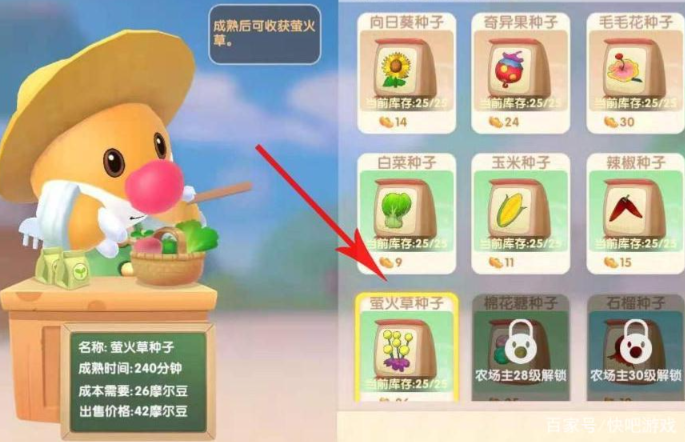 若希望稳定获取萤火草,可前往梅森商店或种子售卖机购买种子。需购买种子需农场主等级达到18级或以上,部分攻略提到可能需要25级,具体以游戏内实际要求为准。购买后需在庄园开垦土地播种,成熟时间约为4小时,期间可使用化肥加速生长。