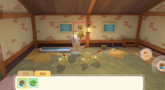 把放养在农场里的小鸡小鸭们收回家禽小屋其实非常简单,只需要找到小屋里的黄色铃铛摇一摇就行啦。这个神奇的铃铛就挂在家禽小屋的墙壁上,进去一眼就能看到,摇动它所有在外溜达的家禽都会慢慢回到小屋。不过它们不会立刻回来,需要耐心等待一会儿,就像我们喊小朋友回家吃饭也需要给他们一点收拾的时间嘛。
