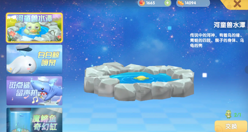 河童是一种传说生物,外形结合了鸟喙、青蛙四肢和乌龟壳的特征,具有浓厚的日式神话色彩。布置河童时需重点考虑其文化属性与栖息环境,通常需要在水域附近设计主题区域。河童仅在下雨天的白天出现,可通过钓鱼获取,之后可兑换专属装饰如河童兽水潭。布置的核心在于结合水域、日式元素与互动功能,打造兼具美观与主题性的景观。