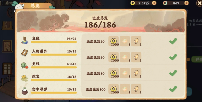 开启念门是桃源深处有人家游戏中的重要任务之一,需要满足特定条件才能触发。玩家需确保角色等级达到21级,舒适度达到2726点,同时完成前置任务南有乔木且完成度达到100%。这些条件是开启念门的硬性要求,若未达标则无法继续后续流程。