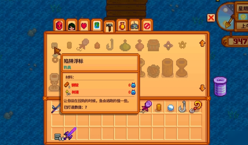 鱼饵的种类很多,基础鱼饵用虫肉就能制作,适合日常钓鱼。如果想钓稀有鱼类,可以使用疯狂鱼饵或特制鱼饵,它们能提高稀有鱼的出现概率。鱼漂的选择更讲究,比如陷阱浮标能让钓鱼条的下降速度变慢,适合钓难度高的鱼;软木塞浮标可以稍微扩大钓鱼条的范围,对新手更友好;倒刺钩则能让钓鱼条自动跟随鱼移动,适合对付行动缓慢的鱼。鱼漂的效果叠加有限,选对合适的比堆数量更重要。