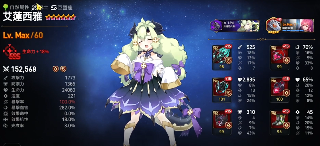 艾莲西雅作为五星自然属性战士,核心机制围绕生命值倍率伤害与功能性展开。她的技能组合包括破甲、驱散、防御增益及伤口效果,适合中速阵地战。装备优先选择伤口套或速度套,主属性以速度为核心,副属性补充防御或免疫。专属装备建议选择2技能增伤,3技能效果命中提升的专属实用性较低。