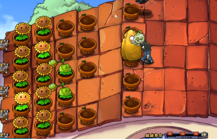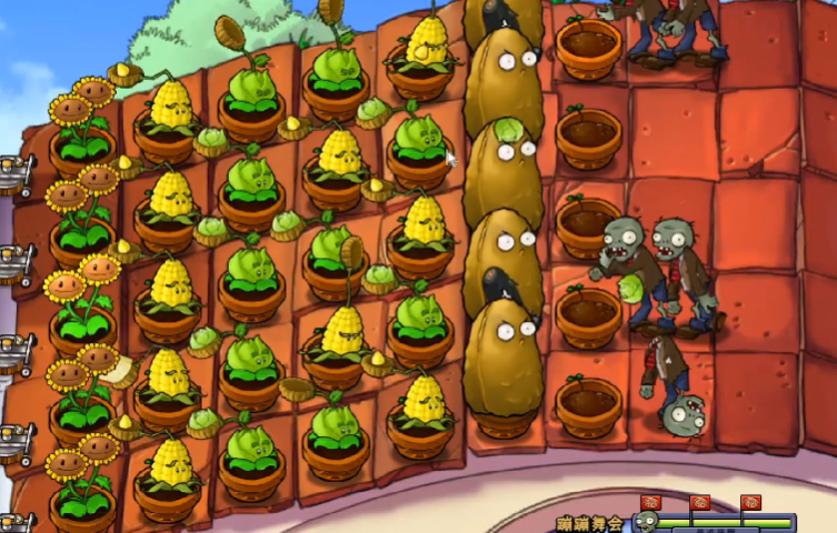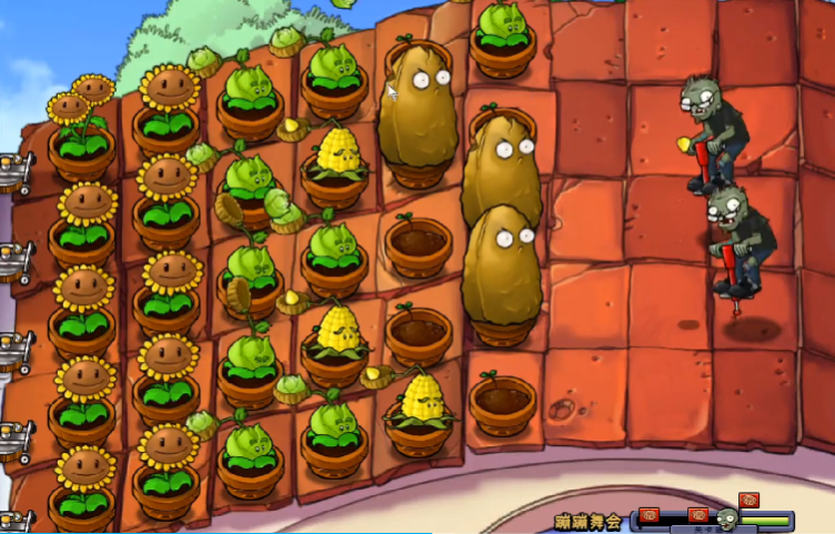 蹦蹦舞会关卡的主要挑战是大量出现的蹦蹦僵尸,其弹跳能力可以越过大多数普通植物,因此必须选用能有效克制此特性的植物。关键的植物选择通常包括向日葵、倭瓜、模仿者倭瓜、磁力菇、西瓜投手以及坚果墙或高坚果。游戏开局后,应立即在第2列和第3列种植两排向日葵,以快速建立稳定的阳光供应体系,这是后续所有布局的经济基础。面对最早出现的蹦蹦僵尸,不要急于种植攻击性植物,而是应在它们行进至最左侧一列时,使用倭瓜将其消灭,相同的策略可以用模仿者倭瓜应对紧随其后的第二只僵尸,此举能以最小消耗安稳度过前期。