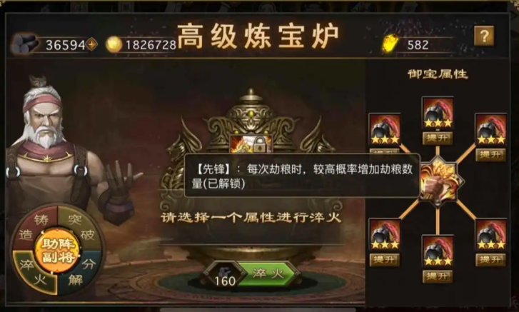 有了图纸和材料,接下来就是打造和强化了。打造御宝需要在兵器界面里的御宝处进行,材料通常需要你去世界上指定的地形攻打城池或开拓封地来收集。打造高级御宝,尤其是红色和紫色的,需要很长时间,你可以用金币购买冷却水来加速。如果你想提升产量,还可以用丹砂提高锻造炉的等级。当你有了紫色御宝后,一定要关注淬火系统,这能让你的紫宝额外获得攻击、防御、血量这些强力属性,是后期拉开战力的关键。至于那些用不上的低品质御宝也别浪费,分解掉可以得到精粹,白色给30,蓝色给60,绿色给150,这些精粹正是用来给紫宝淬火和突破的重要资源。