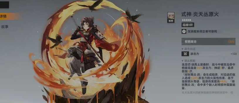 式神·炎天丛原火对龙切的输出提升是全方位的,它不仅增加了基础攻击属性,还通过独特的被击增伤机制和技能特效强化,极大地优化了龙切的实战表现。这使得龙切对专武的需求度很高,拥有了专武能让他在队伍中成为一个更可靠的核心输出点。